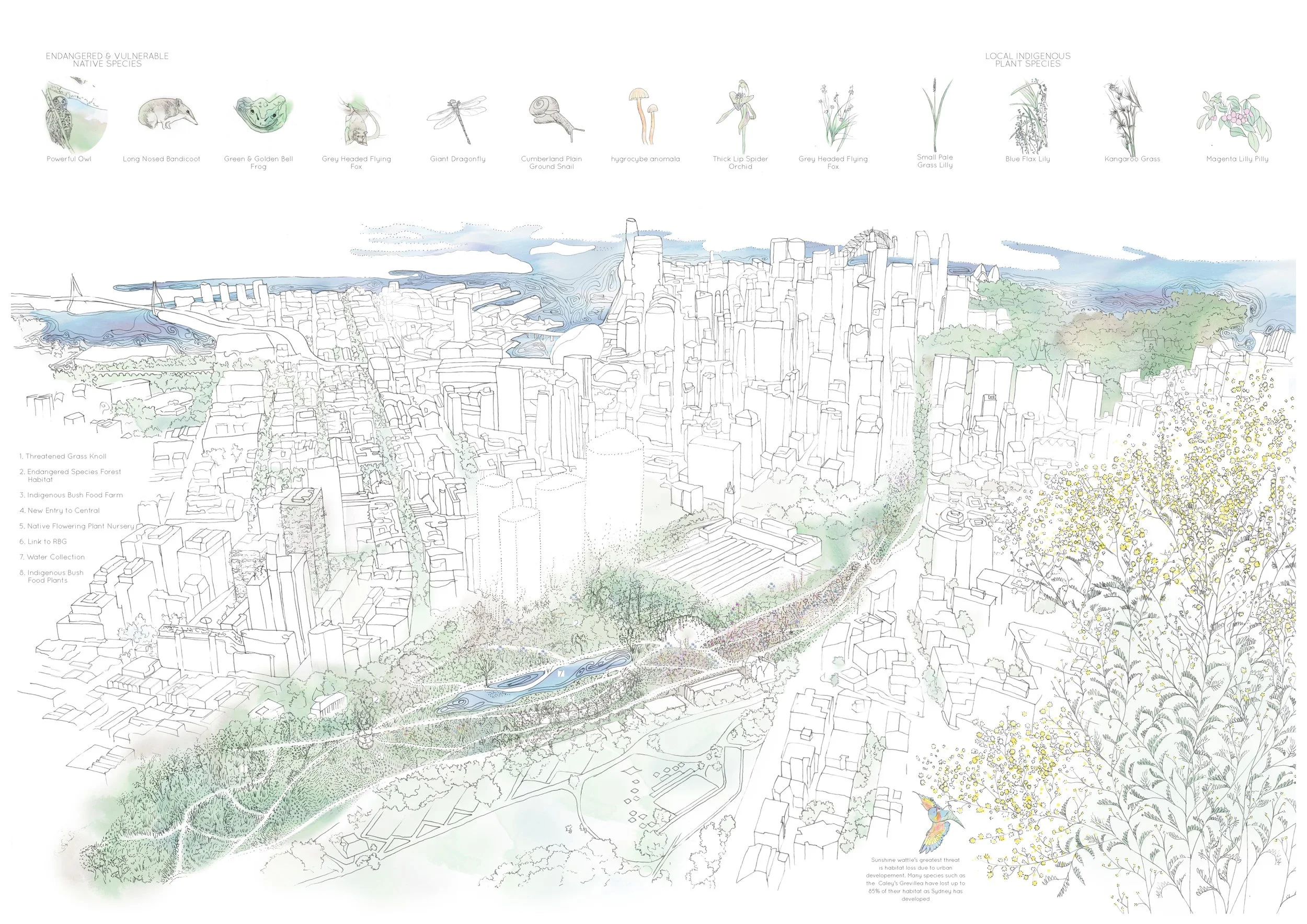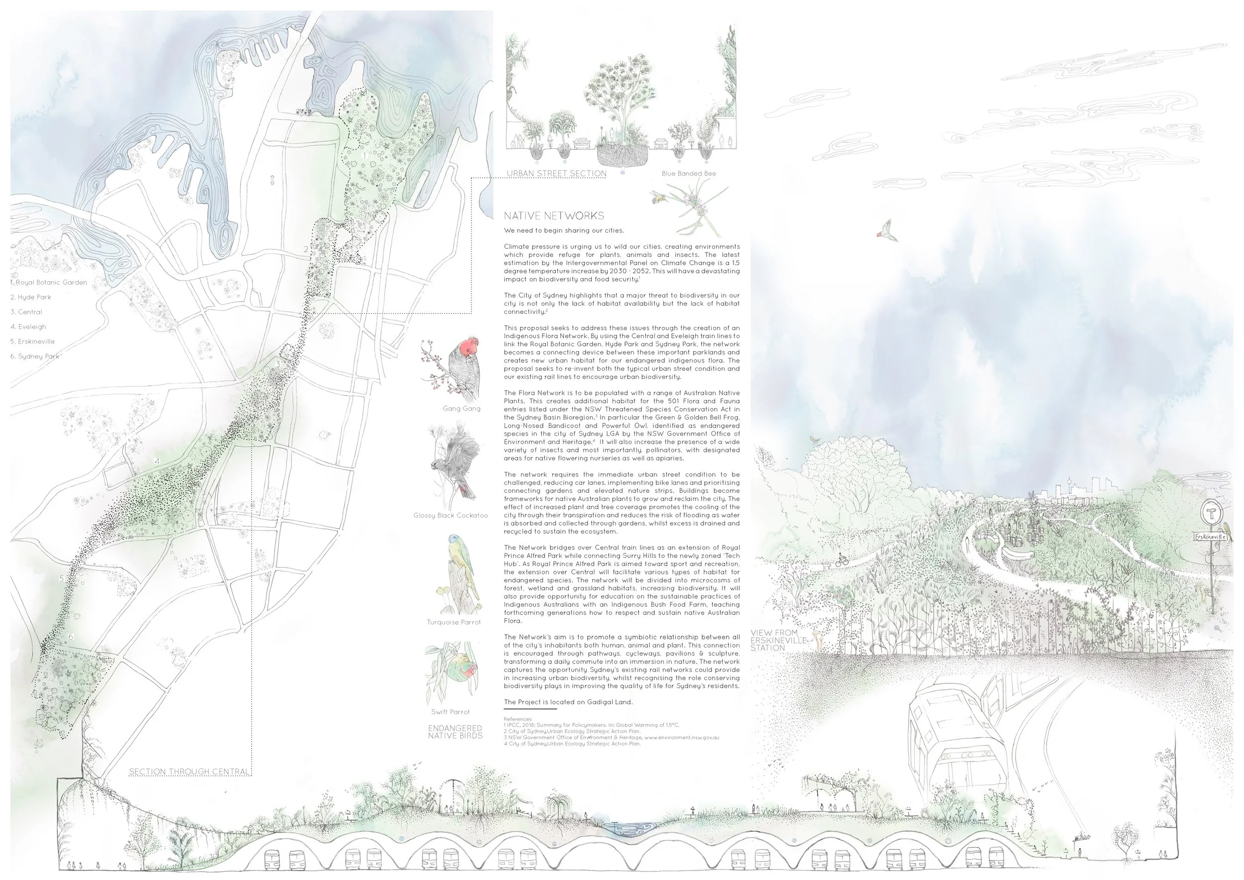 This proposal seeks to address these issues through the creation of an Indigenous Flora Network. By using the Central and Eveleigh train lines to link the Royal Botanic Garden, Hyde Park and Sydney Park, the network becomes a connecting device between these important parklands and creates new urban habitat for our endangered indigenous flora. The proposal seeks to re-invent both the typical urban street condition and our existing rail lines to encourage urban biodiversity.