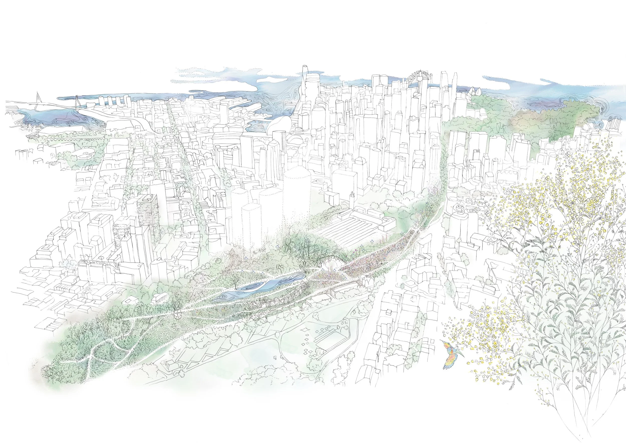 The Network’s aim is to promote a symbiotic relationship between all of the city’s inhabitants both human, animal and plant. This connection is encouraged through pathways, cycleways, pavilions & sculpture, transforming a daily commute into an immersion in nature. The network captures the opportunity Sydney’s existing rail networks could provide in increasing urban biodiversity, whilst recognising the role conserving biodiversity plays in improving the quality of life for Sydney’s residents.